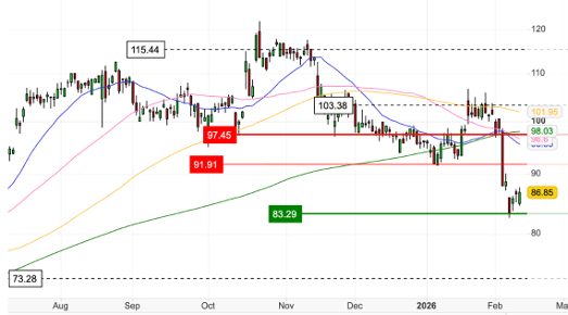 Technically, the recent pull-back from January highs has reset positioning. Trading around the mid-$80s, the shares have found support near $82.29, with momentum indicators cooling from previously stretched levels. Within a 52-week range of $48.80 to $122, the current consolidation appears constructive. A supportive earnings outcome could see renewed interest build toward the $100 level, particularly against an 18.4% annual revenue growth outlook.
