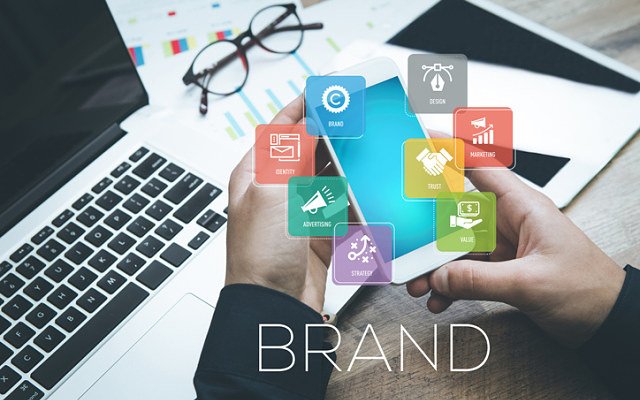 Hand holding smartphone and showing Brand concept