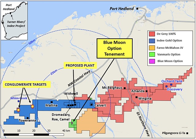 Under the Blue Moon acquisition terms, De Grey Mining will pay the vendor A$125,000 in cash and 600,000 company shares. De Grey Mining will then fund exploration at the project over two years and may elect to acquire 70% of the tenement’s shallow mineral rights for $500,000.