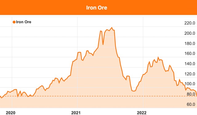 Iron ore has been dragged down by subdued Chinese demand – plunging from US$160 a tonne in April this year to hover around US$80/t this week.