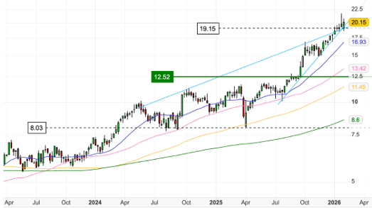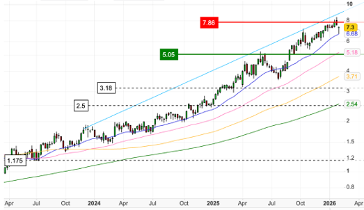 From a technical perspective, we note consistent buying interest on pullbacks toward long-term moving averages. While there has been some operational noise at assets such as Pogo and KCGM, the broader uptrend remains intact. The post-guidance consolidation suggests the market is looking through short-term execution risks and remains focused on the longer-term production uplift and valuation upside.