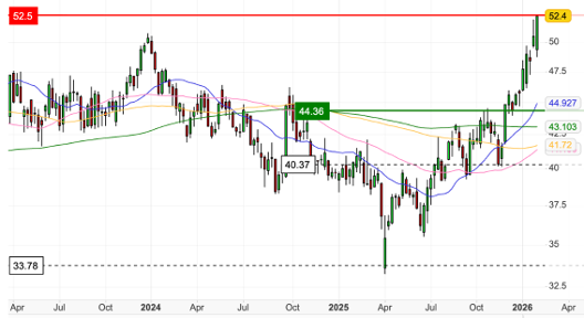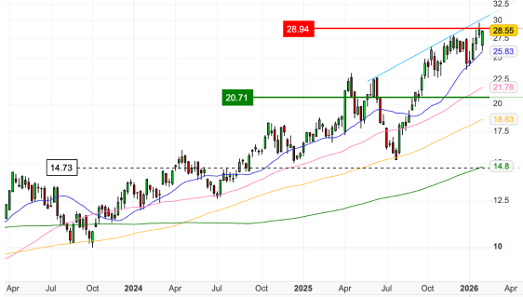 Technically, the share price has staged a sharp V-shaped recovery from its recent correction, returning to levels near multi-year highs. We interpret this as evidence of renewed institutional accumulation. The stock is now testing resistance last seen in late January, and a sustained break higher would likely confirm a new trading range as the market rewards the rapid deleveraging and earnings momentum.