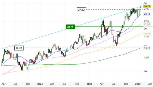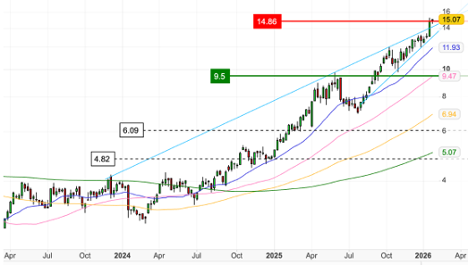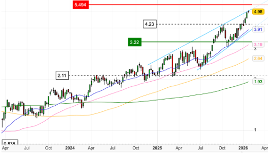 Technically, the picture remains constructive. The stock is making higher highs, and momentum indicators such as the RSI point to sustained buying interest rather than exhaustion. Valuation screens suggest the shares are approaching full value after a rally of more than 40%, but we would caution against relying solely on traditional multiples. At current gold and copper prices, the volume of free cash flow being generated provides a margin of safety that headline P/E ratios are likely understating.