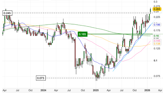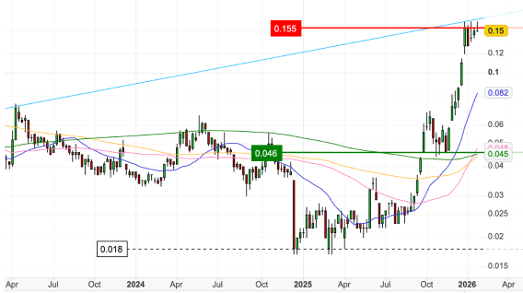 The stock remains a high-beta expression of silver prices and tends to move sharply with the underlying commodity. It is currently testing key resistance levels, and a decisive break would likely trigger a broader re-rating as investors look ahead to the anticipated mid-2026 submission of the updated biodiversity assessment. While the company remains pre-revenue, the market capitalisation continues to sit at a steep discount to the in-situ value of its silver resource, offering substantial upside if permitting risks are resolved.