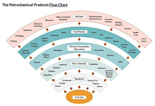 The petrochemical products flow chart makes this explicit. Oil and gas feed into chemical feedstocks. Those feed basic chemicals. From there come intermediates, resins, fibres, solvents, foams, and plastics.