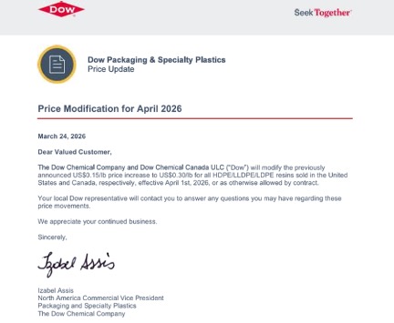 Dow Chemical has just doubled its planned price increase on resin. Not doubling the price. Doubling the increase. The previously announced US 0.15 dollars per pound rise has been revised to US 0.30 dollars per pound on key polyethylene resins, effective April.